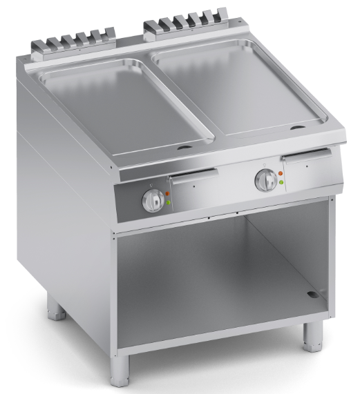 - Uzkarsēšanu nodrošina starojuma sildelementi, kas izvietoti zem cepamās plātnes